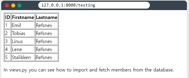 | template.html <table border='1'> <tr> <th>ID</th> <th>Firstname</th> <th>Lastname</th> </tr> {% for x in mymembers %} <tr> <td>{{ x.id }}</td> <td>{{ x.firstname }}</td> <td>{{ x.lastname }}</td> </tr> {% endfor %} </table> |