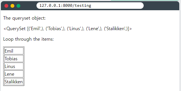 | template.html <!DOCTYPE html> <html> <body> <p>The queryset object:</p> {{ mymembers }} <p>Loop through the items:</p> <table border='1'> {% for x in mymembers %} <tr> <td>{{ x }}</td> </tr> {% endfor %} </table> </body> </html> |