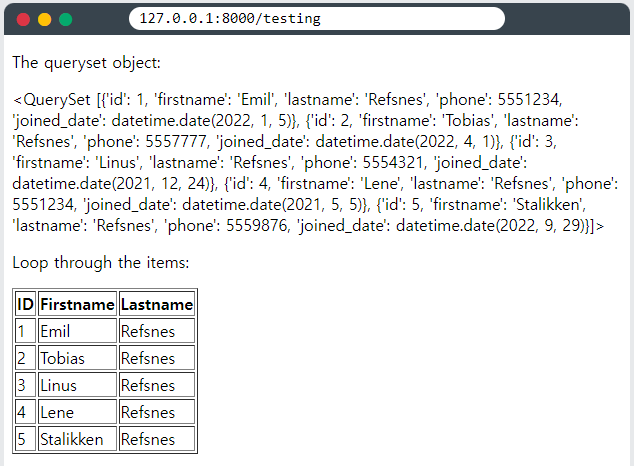 | template.html <!DOCTYPE html> <html> <body> <p>The queryset object:</p> {{ mymembers }} <p>Loop through the items:</p> <table border='1'> <tr> <th>ID</th> <th>Firstname</th> <th>Lastname</th> </tr> {% for x in mymembers %} <tr> <td>{{ x.id }}</td> <td>{{ x.firstname }}</td> <td>{{ x.lastname }}</td> </tr> {% endfor %} </table> </body> </html> |
