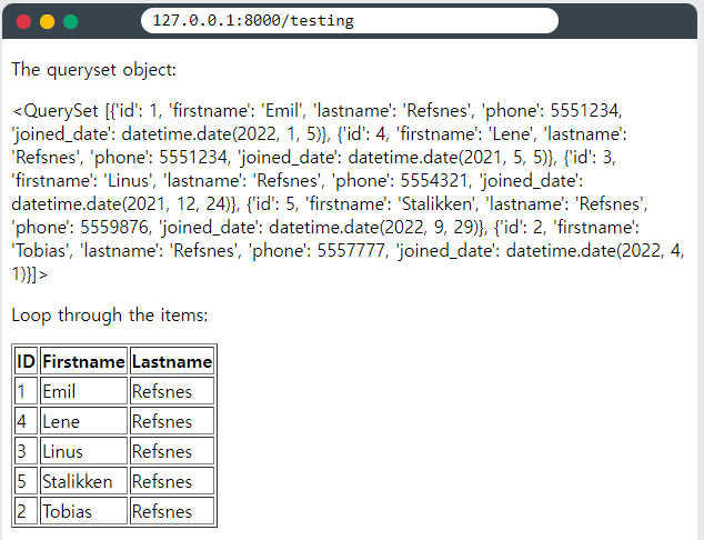 template.html <!DOCTYPE html> <html> <body> <p>The queryset object:</p> {{ mymembers }} <p>Loop through the items:</p> <table border='1'> <tr> <th>ID</th> <th>Firstname</th> <th>Lastname</th> </tr> {% for x in mymembers %} <tr> <td>{{ x.id }}</td> <td>{{ x.firstname }}</td> <td>{{ x.lastname }}</td> </tr> {% endfor %} </table> </body> </html> |