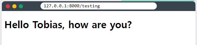 | templates/template.html: <!DOCTYPE html> <html> <body> {% with firstname="Tobias" %} <h1>Hello {{ firstname }}, how are you?</h1> {% endwith %} </body> </html> |