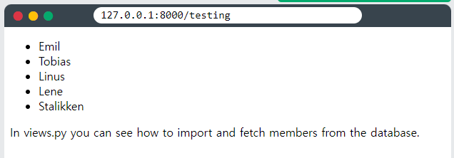 | templates/template.html: <!DOCTYPE html> <html> <body> <ul> {% for x in mymembers %} <li>{{ x.firstname }}</li> {% endfor %} </ul> <p>In views.py you can see how to import and fetch members from the database.</p> </body> </html> |