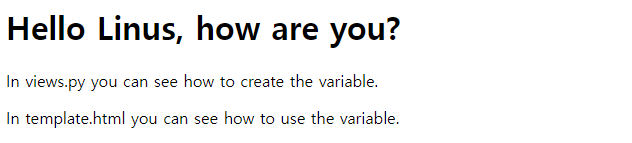 | template.html <!DOCTYPE html> <html> <body> <h1>Hello {{ firstname }}, how are you?</h1> <p>In views.py you can see how to create the variable.</p> <p>In template.html you can see how to use the variable.</p> </body> </html> |