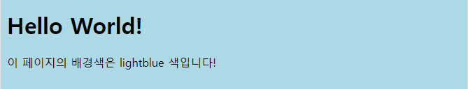 | <!DOCTYPE html> <html> <head> <style> body { background-color: lightblue; } </style> </head> <body> <h1>Hello World!</h1> <p>이 페이지의 배경색은 lightblue 색입니다!</p> </body> </html> |