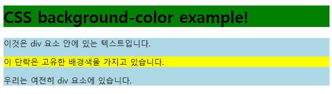 | <!DOCTYPE html> <html> <head> <style> h1 { background-color: green; } div { background-color: lightblue; } p { background-color: yellow; } </style> </head> <body> <h1>CSS background-color example!</h1> <div> 이것은 div 요소 안에 있는 텍스트입니다. <p>이 단락은 고유한 배경색을 가지고 있습니다.</p> 우리는 여전히 div 요소에 있습니다. </div> </body> </html> |