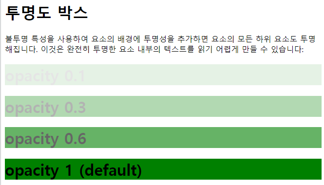 <!DOCTYPE html> <html> <head> <style> div { background-color: green; } div.first { opacity: 0.1; } div.second { opacity: 0.3; } div.third { opacity: 0.6; } </style> </head> <body> <h1>투명도 박스</h1> <p>불투명 특성을 사용하여 요소의 배경에 투명성을 추가하면 요소의 모든 하위 요소도 투명해집니다. 이것은 완전히 투명한 요소 내부의 텍스트를 읽기 어렵게 만들 수 있습니다:</p> <div class="first"> <h1>opacity 0.1</h1> </div> <div class="second"> <h1>opacity 0.3</h1> </div> <div class="third"> <h1>opacity 0.6</h1> </div> <div> <h1>opacity 1 (default)</h1> </div> </body> </html> |
