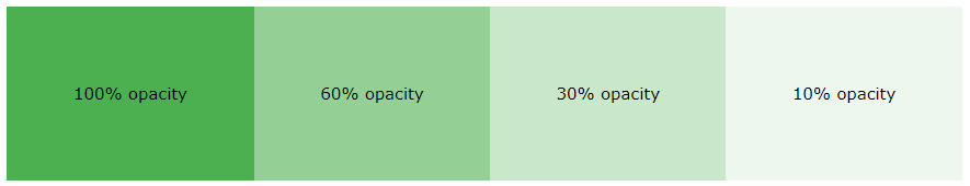 | <!DOCTYPE html> <html> <head> <style> div { background-color: green; } div.first { opacity: 0.1; } div.second { opacity: 0.3; } div.third { opacity: 0.6; } </style> </head> <body> <h1>투명도 박스</h1> <p>불투명 특성을 사용하여 요소의 배경에 투명성을 추가하면 요소의 모든 하위 요소도 투명해집니다. 이것은 완전히 투명한 요소 내부의 텍스트를 읽기 어렵게 만들 수 있습니다:</p> <div class="first"> <h1>opacity 0.1</h1> </div> <div class="second"> <h1>opacity 0.3</h1> </div> <div class="third"> <h1>opacity 0.6</h1> </div> <div> <h1>opacity 1 (default)</h1> </div> </body> </html> |