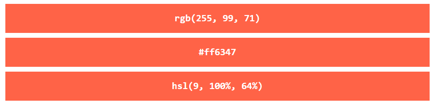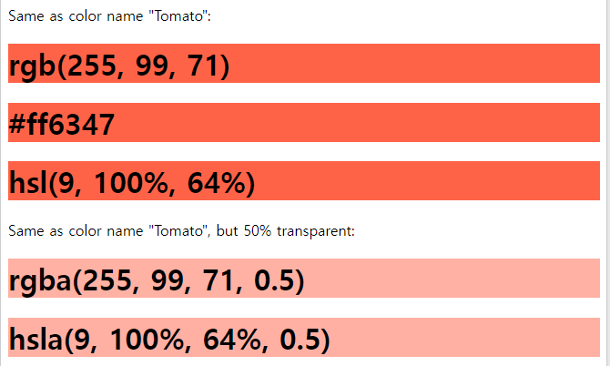 | <!DOCTYPE html> <html> <body> <p>Same as color name "Tomato":</p> <h1 style="background-color:rgb(255, 99, 71);">rgb(255, 99, 71)</h1> <h1 style="background-color:#ff6347;">#ff6347</h1> <h1 style="background-color:hsl(9, 100%, 64%);">hsl(9, 100%, 64%)</h1> <p>Same as color name "Tomato", but 50% transparent:</p> <h1 style="background-color:rgba(255, 99, 71, 0.5);">rgba(255, 99, 71, 0.5)</h1> <h1 style="background-color:hsla(9, 100%, 64%, 0.5);">hsla(9, 100%, 64%, 0.5)</h1> <p>In addition to the predefined color names, colors can be specified using RGB, HEX, HSL, or even transparent colors using RGBA or HSLA color values.</p> </body> </html> |