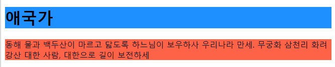 | <!DOCTYPE html> <html> <body> <h1 style="background-color:DodgerBlue;">애국가</h1> <p style="background-color:Tomato;"> 동해 물과 백두산이 마르고 닳도록 하느님이 보우하사 우리나라 만세. 무궁화 삼천리 화려강산 대한 사람, 대한으로 길이 보전하세 </p> </body> </html> |