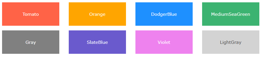 | <!DOCTYPE html> <html> <body> <h1 style="background-color:Tomato;">Tomato</h1> <h1 style="background-color:Orange;">Orange</h1> <h1 style="background-color:DodgerBlue;">DodgerBlue</h1> <h1 style="background-color:MediumSeaGreen;">MediumSeaGreen</h1> <h1 style="background-color:Gray;">Gray</h1> <h1 style="background-color:SlateBlue;">SlateBlue</h1> <h1 style="background-color:Violet;">Violet</h1> <h1 style="background-color:LightGray;">LightGray</h1> </body> </html> |