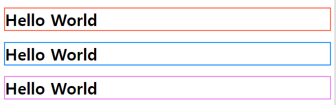 | <!DOCTYPE html> <html> <body> <h1 style="border: 2px solid Tomato;">Hello World</h1> <h1 style="border: 2px solid DodgerBlue;">Hello World</h1> <h1 style="border: 2px solid Violet;">Hello World</h1> </body> </html> |