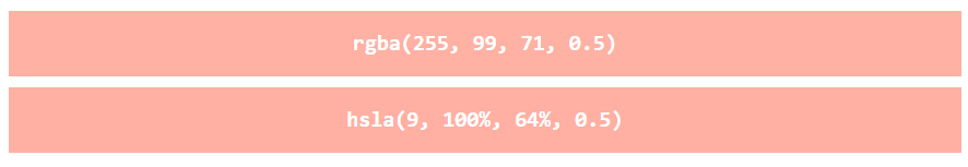 | <!DOCTYPE html> <html> <body> <p>Same as color name "Tomato":</p> <h1 style="background-color:rgb(255, 99, 71);">rgb(255, 99, 71)</h1> <h1 style="background-color:#ff6347;">#ff6347</h1> <h1 style="background-color:hsl(9, 100%, 64%);">hsl(9, 100%, 64%)</h1> <p>Same as color name "Tomato", but 50% transparent:</p> <h1 style="background-color:rgba(255, 99, 71, 0.5);">rgba(255, 99, 71, 0.5)</h1> <h1 style="background-color:hsla(9, 100%, 64%, 0.5);">hsla(9, 100%, 64%, 0.5)</h1> <p>In addition to the predefined color names, colors can be specified using RGB, HEX, HSL, or even transparent colors using RGBA or HSLA color values.</p> </body> </html> |