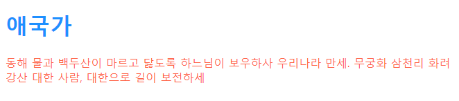 | <!DOCTYPE html> <html> <body> <h1 style="color:DodgerBlue;">애국가</h1> <p style="color:Tomato;"> 동해 물과 백두산이 마르고 닳도록 하느님이 보우하사 우리나라 만세. 무궁화 삼천리 화려강산 대한 사람, 대한으로 길이 보전하세 </p> </body> </html> |