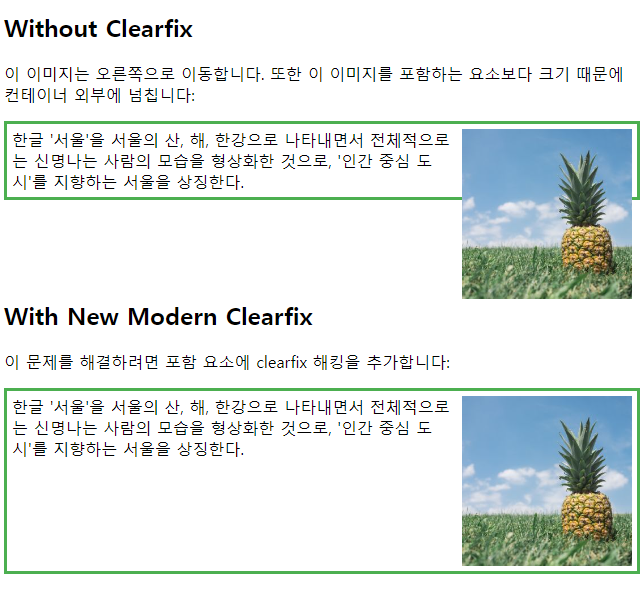<!DOCTYPE html> <html> <head> <style> div { border: 3px solid #4CAF50; padding: 5px; } .img1 { float: right; } .img2 { float: right; } .clearfix::after { content: ""; clear: both; display: table; } </style> </head> <body> <h2>Without Clearfix</h2> <p>이 이미지는 오른쪽으로 이동합니다. 또한 이 이미지를 포함하는 요소보다 크기 때문에 컨테이너 외부에 넘칩니다:</p> <div> <img class="img1" src="pineapple.jpg" alt="Pineapple" width="170" height="170"> 한글 '서울'을 서울의 산, 해, 한강으로 나타내면서 전체적으로는 신명나는 사람의 모습을 형상화한 것으로, '인간 중심 도시'를 지향하는 서울을 상징한다. </div> <h2 style="clear:right">With New Modern Clearfix</h2> <p>이 문제를 해결하려면 포함 요소에 clearfix 해킹을 추가합니다:</p> <div class="clearfix"> <img class="img2" src="pineapple.jpg" alt="Pineapple" width="170" height="170"> 한글 '서울'을 서울의 산, 해, 한강으로 나타내면서 전체적으로는 신명나는 사람의 모습을 형상화한 것으로, '인간 중심 도시'를 지향하는 서울을 상징한다. </div> </body> </html> |