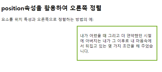 <!DOCTYPE html> <html> <head> <style> .right { position: absolute; right: 0px; width: 300px; border: 3px solid #73AD21; padding: 10px; } </style> </head> <body> <h2>position속성을 활용하여 오른쪽 정렬</h2> <p>요소를 위치 특성과 오른쪽으로 정렬하는 방법의 예:</p> <div class="right"> <p>내가 어렸을 때 그리고 더 연약했던 시절에 아버지는 내가 그 이후로 내 마음속에서 뒤집고 있는 몇 가지 조언을 해 주었습니다.</p> </div> </body> </html> |