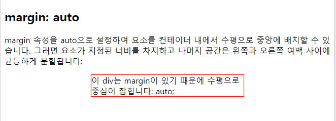 | <!DOCTYPE html> <html> <head> <style> div { width: 300px; margin: auto; border: 1px solid red; } </style> </head> <body> <h2>margin: auto</h2> <p>margin 속성을 auto으로 설정하여 요소를 컨테이너 내에서 수평으로 중앙에 배치할 수 있습니다. 그러면 요소가 지정된 너비를 차지하고 나머지 공간은 왼쪽과 오른쪽 여백 사이에 균등하게 분할됩니다:</p> <div> 이 div는 margin이 있기 때문에 수평으로 중심이 잡힙니다: auto; </div> </body> </html> |