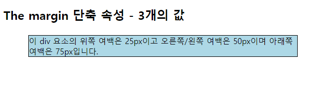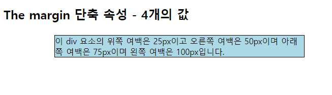 | <!DOCTYPE html> <html> <head> <style> div { border: 1px solid black; margin: 25px 50px 75px; background-color: lightblue; } </style> </head> <body> <h2>The margin 단축 속성 - 3개의 값</h2> <div>이 div 요소의 위쪽 여백은 25px이고 오른쪽/왼쪽 여백은 50px이며 아래쪽 여백은 75px입니다.</div> <hr> </body> </html> |