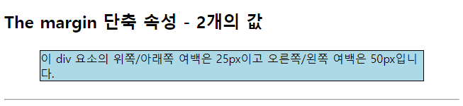 | <!DOCTYPE html> <html> <head> <style> div { border: 1px solid black; margin: 25px 50px; background-color: lightblue; } </style> </head> <body> <h2>The margin 단축 속성 - 2개의 값</h2> <div>이 div 요소의 위쪽/아래쪽 여백은 25px이고 오른쪽/왼쪽 여백은 50px입니다.</div> <hr> </body> </html> |
