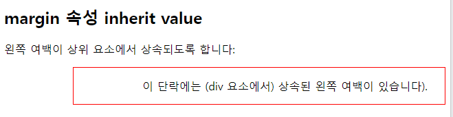 | <!DOCTYPE html> <html> <head> <style> div { border: 1px solid red; margin-left: 100px; } p.ex1 { margin-left: inherit; } </style> </head> <body> <h2>margin 속성 inherit value</h2> <p>왼쪽 여백이 상위 요소에서 상속되도록 합니다:</p> <div> <p class="ex1">이 단락에는 (div 요소에서) 상속된 왼쪽 여백이 있습니다).</p> </div> </body> </html> |