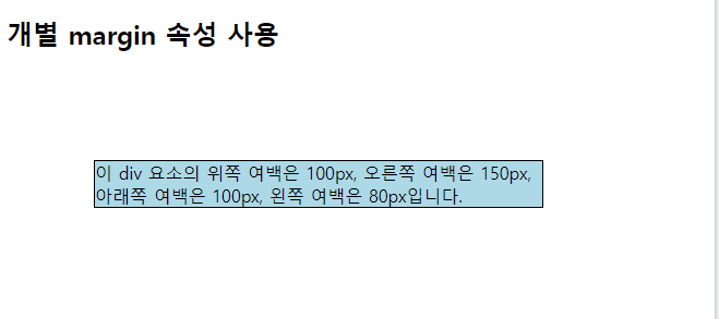 | <!DOCTYPE html> <html> <head> <style> div { border: 1px solid black; margin-top: 100px; margin-bottom: 100px; margin-right: 150px; margin-left: 80px; background-color: lightblue; } </style> </head> <body> <h2>개별 margin 속성 사용</h2> <div>이 div 요소의 위쪽 여백은 100px, 오른쪽 여백은 150px, 아래쪽 여백은 100px, 왼쪽 여백은 80px입니다.</div> </body> </html> |