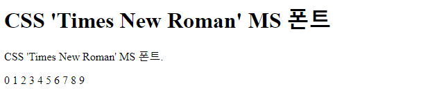 | <!DOCTYPE html> <html> <head> <style> body { font-family: 'Times New Roman', sans-serif; } </style> </head> <body> <h1>CSS 'Times New Roman' MS 폰트</h1> <p>CSS 'Times New Roman' MS 폰트.</p> <p>0 1 2 3 4 5 6 7 8 9</p> </body> </html> |