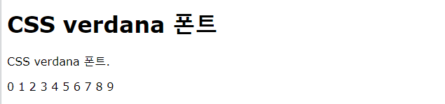 | <!DOCTYPE html> <html> <head> <style> body { font-family: Verdana, sans-serif; } </style> </head> <body> <h1>CSS Verdana 폰트</h1> <p>CSS Verdana 폰트.</p> <p>0 1 2 3 4 5 6 7 8 9</p> </body> </html> |
