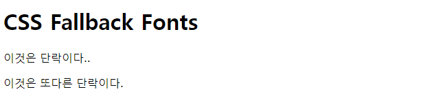 | <!DOCTYPE html> <html> <head> <style> p { font-family: Tahoma, Verdana, sans-serif; } </style> </head> <body> <h1>CSS Fallback Fonts</h1> <p>이것은 단락이다..</p> <p>이것은 또다른 단락이다.</p> </body> </html> |