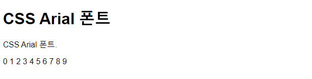 | <!DOCTYPE html> <html> <head> <style> body { font-family: Arial, sans-serif; } </style> </head> <body> <h1>CSS Arial 폰트</h1> <p>CSS Arial 폰트.</p> <p>0 1 2 3 4 5 6 7 8 9</p> </body> </html> |