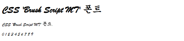 | <!DOCTYPE html> <html> <head> <style> body { font-family: 'Brush Script MT', cursive; } </style> </head> <body> <h1>CSS 'Brush Script MT' 폰트</h1> <p>CSS 'Brush Script MT' 폰트.</p> <p>0 1 2 3 4 5 6 7 8 9</p> </body> </html> |