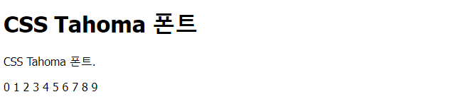 | <!DOCTYPE html> <html> <head> <style> body { font-family: Tahoma, sans-serif; } </style> </head> <body> <h1>CSS Tahoma 폰트</h1> <p>CSS Tahoma 폰트.</p> <p>0 1 2 3 4 5 6 7 8 9</p> </body> </html> |