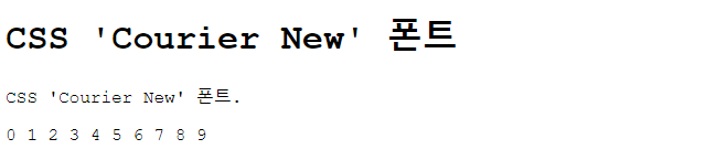 | <!DOCTYPE html> <html> <head> <style> body { font-family: 'Courier New', sans-serif; } </style> </head> <body> <h1>CSS 'Courier New' 폰트</h1> <p>CSS 'Courier New' 폰트.</p> <p>0 1 2 3 4 5 6 7 8 9</p> </body> </html> |