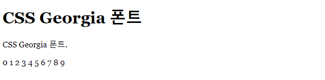 | <!DOCTYPE html> <html> <head> <style> body { font-family: Georgia, sans-serif; } </style> </head> <body> <h1>CSS Georgia 폰트</h1> <p>CSS Georgia 폰트.</p> <p>0 1 2 3 4 5 6 7 8 9</p> </body> </html> |