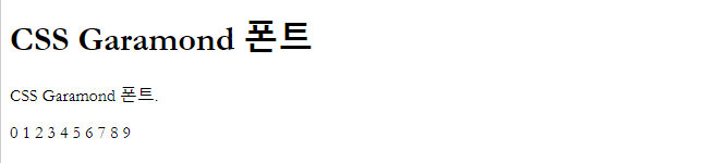 | <!DOCTYPE html> <html> <head> <style> body { font-family: Garamond, sans-serif; } </style> </head> <body> <h1>CSS Garamond 폰트</h1> <p>CSS Garamond 폰트.</p> <p>0 1 2 3 4 5 6 7 8 9</p> </body> </html> |