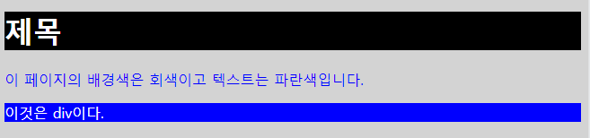 | <!DOCTYPE html> <html> <head> <style> body { background-color: lightgrey; color: blue; } h1 { background-color: black; color: white; } div { background-color: blue; color: white; } </style> </head> <body> <h1>제목</h1> <p>이 페이지의 배경색은 회색이고 텍스트는 파란색입니다.</p> <div>이것은 div이다.</div> </body> </html> |
