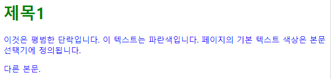 <!DOCTYPE html> <html> <head> <style> body { color: blue; } h1 { color: green; } </style> </head> <body> <h1>제목1</h1> <p>이것은 평범한 단락입니다. 이 텍스트는 파란색입니다. 페이지의 기본 텍스트 색상은 본문 선택기에 정의됩니다.</p> <p>다른 본문.</p> </body> </html> |