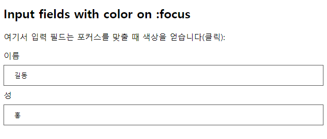 | <!DOCTYPE html> <html> <head> <style> input[type=text] { width: 100%; padding: 12px 20px; margin: 8px 0; box-sizing: border-box; border: 3px solid #ccc; -webkit-transition: 0.5s; transition: 0.5s; outline: none; } input[type=text]:focus { border: 3px solid #555; } </style> </head> <body> <h2>Input fields with black border on :focus</h2> <p>여기서 입력 필드는 포커스를 맞출 때 검은색 테두리 색상을 얻습니다(클릭). 테두리 색상을 애니메이션하기 위해 CSS 전환 속성도 추가했습니다(포커스 색상 변경에 0.5초 소요):</p> <form> <label for="fname">이름</label> <input type="text" id="fname" name="fname" value="길동"> <label for="lname">성</label> <input type="text" id="lname" name="lname" value="홍"> </form> </body> </html> |