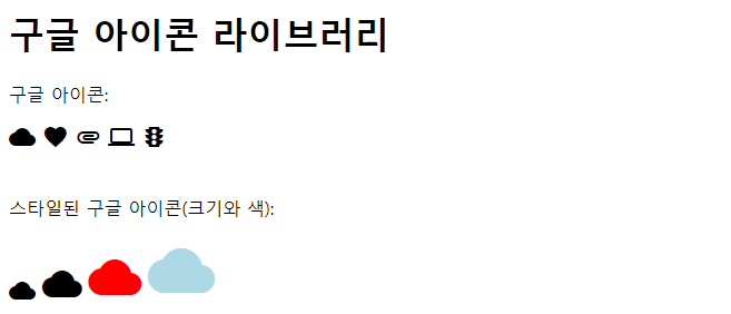 | <!DOCTYPE html> <html> <head> <title>Google Icons</title> <meta name="viewport" content="width=device-width, initial-scale=1"> <link rel="stylesheet" href=" https://fonts.googleapis.com/icon?family=Material+Icons "> </head> <body> <h1>구글 아이콘 라이브러리</h1> <p>구글 아이콘:</p> <i class="material-icons">cloud</i> <i class="material-icons">favorite</i> <i class="material-icons">attachment</i> <i class="material-icons">computer</i> <i class="material-icons">traffic</i> <br><br> <p>스타일된 구글 아이콘(크기와 색):</p> <i class="material-icons" style="font-size:24px;">cloud</i> <i class="material-icons" style="font-size:36px;">cloud</i> <i class="material-icons" style="font-size:48px;color:red;">cloud</i> <i class="material-icons" style="font-size:60px;color:lightblue;">cloud</i> </body> </html> |