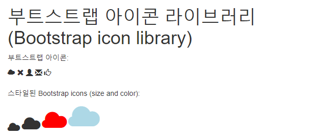 | <!DOCTYPE html> <html> <head> <title>Bootstrap Icons</title> <meta name="viewport" content="width=device-width, initial-scale=1"> <link rel="stylesheet" href="https://maxcdn.bootstrapcdn.com/bootstrap/3.3.7/css/bootstrap.min.css"> </head> <body class="container"> <h1>부트스트랩 아이콘 라이브러리(Bootstrap icon library)</h1> <p>부트스트랩 아이콘:</p> <i class="glyphicon glyphicon-cloud"></i> <i class="glyphicon glyphicon-remove"></i> <i class="glyphicon glyphicon-user"></i> <i class="glyphicon glyphicon-envelope"></i> <i class="glyphicon glyphicon-thumbs-up"></i> <br><br> <p>스타일된 Bootstrap icons (size and color):</p> <i class="glyphicon glyphicon-cloud" style="font-size:24px;"></i> <i class="glyphicon glyphicon-cloud" style="font-size:36px;"></i> <i class="glyphicon glyphicon-cloud" style="font-size:48px;color:red;"></i> <i class="glyphicon glyphicon-cloud" style="font-size:60px;color:lightblue;"></i> </body> </html> |