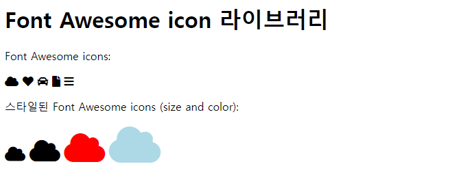 <!DOCTYPE html> <html> <head> <title>Font Awesome Icons</title> <meta name="viewport" content="width=device-width, initial-scale=1"> <script src="https://kit.fontawesome.com/a076d05399.js" crossorigin="anonymous"></script> <!--Get your own code at fontawesome.com--> </head> <body> <h1>Font Awesome icon 라이브러리</h1> <p>Font Awesome icons:</p> <i class="fas fa-cloud"></i> <i class="fas fa-heart"></i> <i class="fas fa-car"></i> <i class="fas fa-file"></i> <i class="fas fa-bars"></i> <p>스타일된 Font Awesome icons (size and color):</p> <i class="fas fa-cloud" style="font-size:24px;"></i> <i class="fas fa-cloud" style="font-size:36px;"></i> <i class="fas fa-cloud" style="font-size:48px;color:red;"></i> <i class="fas fa-cloud" style="font-size:60px;color:lightblue;"></i> </body> </html> |