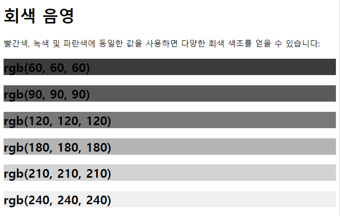 | <!DOCTYPE html> <html> <body> <h1>회색 음영</h1> <p>빨간색, 녹색 및 파란색에 동일한 값을 사용하면 다양한 회색 색조를 얻을 수 있습니다:</p> <h2 style="background-color:rgb(60, 60, 60);">rgb(60, 60, 60)</h2> <h2 style="background-color:rgb(90, 90, 90);">rgb(90, 90, 90)</h2> <h2 style="background-color:rgb(120, 120, 120);">rgb(120, 120, 120)</h2> <h2 style="background-color:rgb(180, 180, 180);">rgb(180, 180, 180)</h2> <h2 style="background-color:rgb(210, 210, 210);">rgb(210, 210, 210)</h2> <h2 style="background-color:rgb(240, 240, 240);">rgb(240, 240, 240)</h2> </body> </html> |