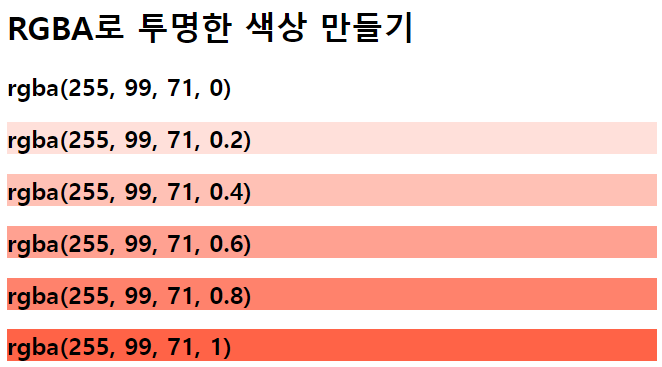 | <!DOCTYPE html> <html> <body> <h1>RGBA로 투명한 색상 만들기</h1> <h2 style="background-color:rgba(255, 99, 71, 0);">rgba(255, 99, 71, 0)</h2> <h2 style="background-color:rgba(255, 99, 71, 0.2);">rgba(255, 99, 71, 0.2)</h2> <h2 style="background-color:rgba(255, 99, 71, 0.4);">rgba(255, 99, 71, 0.4)</h2> <h2 style="background-color:rgba(255, 99, 71, 0.6);">rgba(255, 99, 71, 0.6)</h2> <h2 style="background-color:rgba(255, 99, 71, 0.8);">rgba(255, 99, 71, 0.8)</h2> <h2 style="background-color:rgba(255, 99, 71, 1);">rgba(255, 99, 71, 1)</h2> </body> </html> |