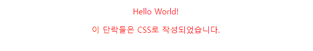 | <!DOCTYPE html> <html> <head> <style> p { color: red; text-align: center; } </style> </head> <body> <p>Hello World!</p> <p>이 단락들은 CSS로 작성되었습니다.</p> </body> </html> |