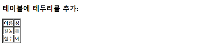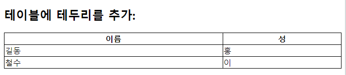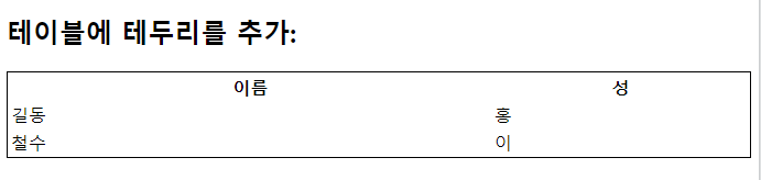 | <!DOCTYPE html> <html> <head> <style> table, th, td { border: 1px solid; } </style> </head> <body> <h2>테이블에 테두리를 추가:</h2> <table> <tr> <th>이름</th> <th>성</th> </tr> <tr> <td>길동</td> <td>홍</td> </tr> <tr> <td>철수</td> <td>이</td> </tr> </table> </body> </html> |