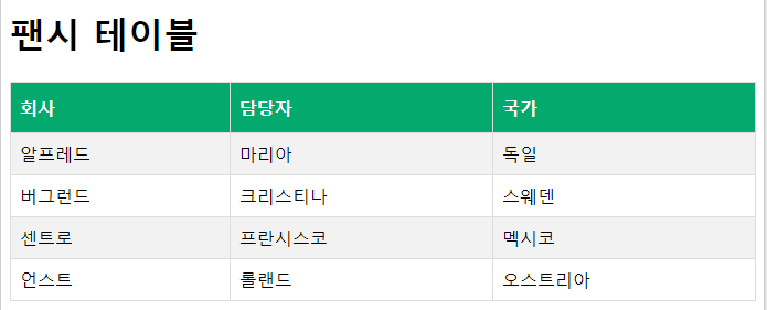 | <!DOCTYPE html> <html> <head> <style> #customers { font-family: Arial, Helvetica, sans-serif; border-collapse: collapse; width: 100%; } #customers td, #customers th { border: 1px solid #ddd; padding: 8px; } #customers tr:nth-child(even){background-color: #f2f2f2;} #customers tr:hover {background-color: #ddd;} #customers th { padding-top: 12px; padding-bottom: 12px; text-align: left; background-color: #04AA6D; color: white; } </style> </head> <body> <h1>팬시 테이블</h1> <table id="customers"> <tr> <th>회사</th> <th>담당자</th> <th>국가</th> </tr> <tr> <td>알프레드</td> <td>마리아</td> <td>독일</td> </tr> <tr> <td>버그런드</td> <td>크리스티나</td> <td>스웨덴</td> </tr> <tr> <td>센트로</td> <td>프란시스코</td> <td>멕시코</td> </tr> <tr> <td>언스트</td> <td>롤랜드</td> <td>오스트리아</td> </tr> </table> </body> </html> |