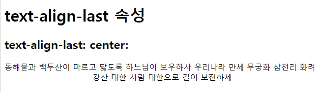 <!DOCTYPE html> <html> <head> <style> p.a { text-align-last: center; } </style> </head> <body> <h1>text-align-last 속성</h1> <h2>text-align-last: center:</h2> <p class="a">동해물과 백두산이 마르고 닳도록 하느님이 보우하사 우리나라 만세 무궁화 삼천리 화려 강산 대한 사람 대한으로 길이 보전하세</p> </body> </html> |