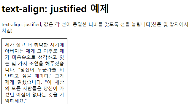 <!DOCTYPE html> <html> <head> <style> div { border: 1px solid black; padding: 10px; width: 200px; height: 200px; text-align: justify; } </style> </head> <body> <h1>text-align: justify 예제</h1> <p>text-align: justified; 값은 각 선이 동일한 너비를 갖도록 선을 늘립니다(신문 및 잡지에서처럼).</p> <div> 제가 젊고 더 취약한 시기에 아버지는 제게 그 이후로 제가 마음속으로 생각하고 있는 몇 가지 조언을 해주셨습니다. "당신이 누군가를 비난하고 싶을 때마다," 그가 제게 말했습니다. "이 세상의 모든 사람들은 당신이 가졌던 이점이 없다는 것을 기억하세요." </div> </body> </html> |