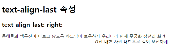 <!DOCTYPE html> <html> <head> <style> p.a { text-align-last: right; } </style> </head> <body> <h1>text-align-last 속성</h1> <h2>text-align-last: right:</h2> <p class="a">동해물과 백두산이 마르고 닳도록 하느님이 보우하사 우리나라 만세 무궁화 삼천리 화려 강산 대한 사람 대한으로 길이 보전하세</p> </body> </html> |