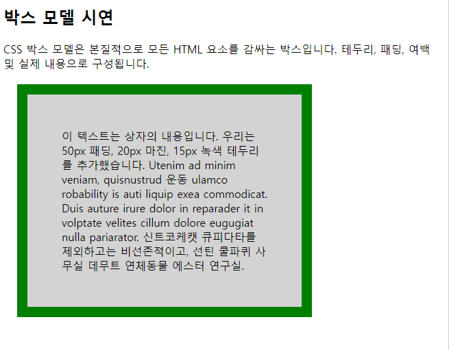 | <html> <head> <style> div { background-color: lightgrey; width: 300px; border: 15px solid green; padding: 50px; margin: 20px; } </style> </head> <body> <h2>박스 모델 시연</h2> <p>CSS 박스 모델은 본질적으로 모든 HTML 요소를 감싸는 박스입니다. 테두리, 패딩, 여백 및 실제 내용으로 구성됩니다.</p> <div>이 텍스트는 상자의 내용입니다. 우리는 50px 패딩, 20px 마진, 15px 녹색 테두리를 추가했습니다. Utenim ad minim veniam, quisnustrud 운동 ulamco robability is auti liquip exea commodicat. Duis auture irure dolor in reparader it in volptate velites cillum dolore eugugiat nulla pariarator. 신트코케캣 큐피다타를 제외하고는 비선존적이고, 선틴 쿨파퀴 사무실 데무트 연체동물 에스터 연구실.</div> </body> </html> |