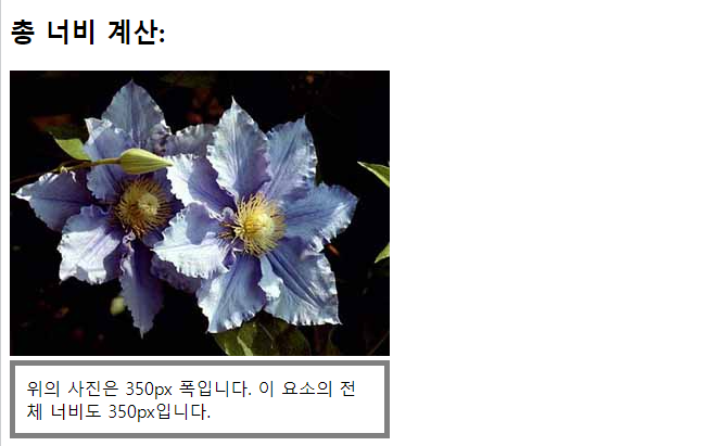 | <!DOCTYPE html> <html> <head> <style> div { width: 320px; padding: 10px; border: 5px solid gray; margin: 0; } </style> </head> <body> <h2>총 너비 계산:</h2> <img src="klematis4_big.jpg" width="350" height="263" alt="Klematis"> <div>위의 사진은 350px 폭입니다. 이 요소의 전체 너비도 350px입니다.</div> </body> </html> |