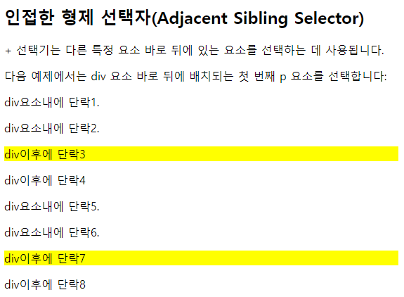 다시 div 요소 다음에 인접한 p요소 '단락7'이 배경색 노랑으로 설정되는 것을 알 수 있다. 위의 코드를 실행한 결과 화면은 아래 그림과 같다.